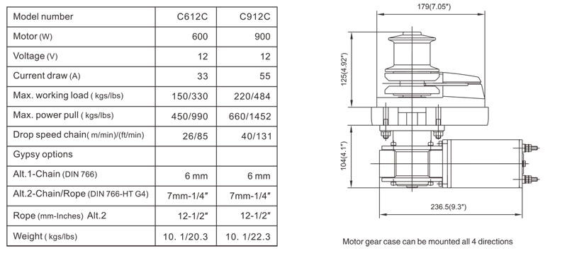 With parts above the deck made of high polished stainless steel 316. Powerful and compact windlass made specially for the rigid conditions of the sea. Suitable for the boat with adequate space under-neath deck and with deck thickness less that 50mm(2). With motor/gear underneath deck offers this model a very smooth and silent operation. Easy to vertically install, adjustable clutch, works with chain only or rope/chain combination.