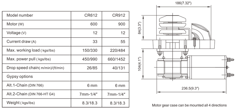 With parts above the deck made of high polished stainless steel 316. Powerful and compact windlass made specially for the rigid conditions of the sea. Suitable for the boat with adequate space under-neath deck and with deck thickness less that 50mm(2). With motor/gear underneath deck offers this model a very smooth and silent operation. Easy to vertically install, adjustable clutch, works with chain only or rope/chain combination